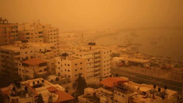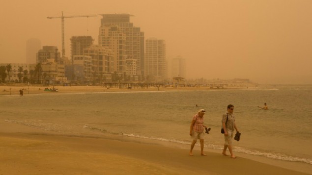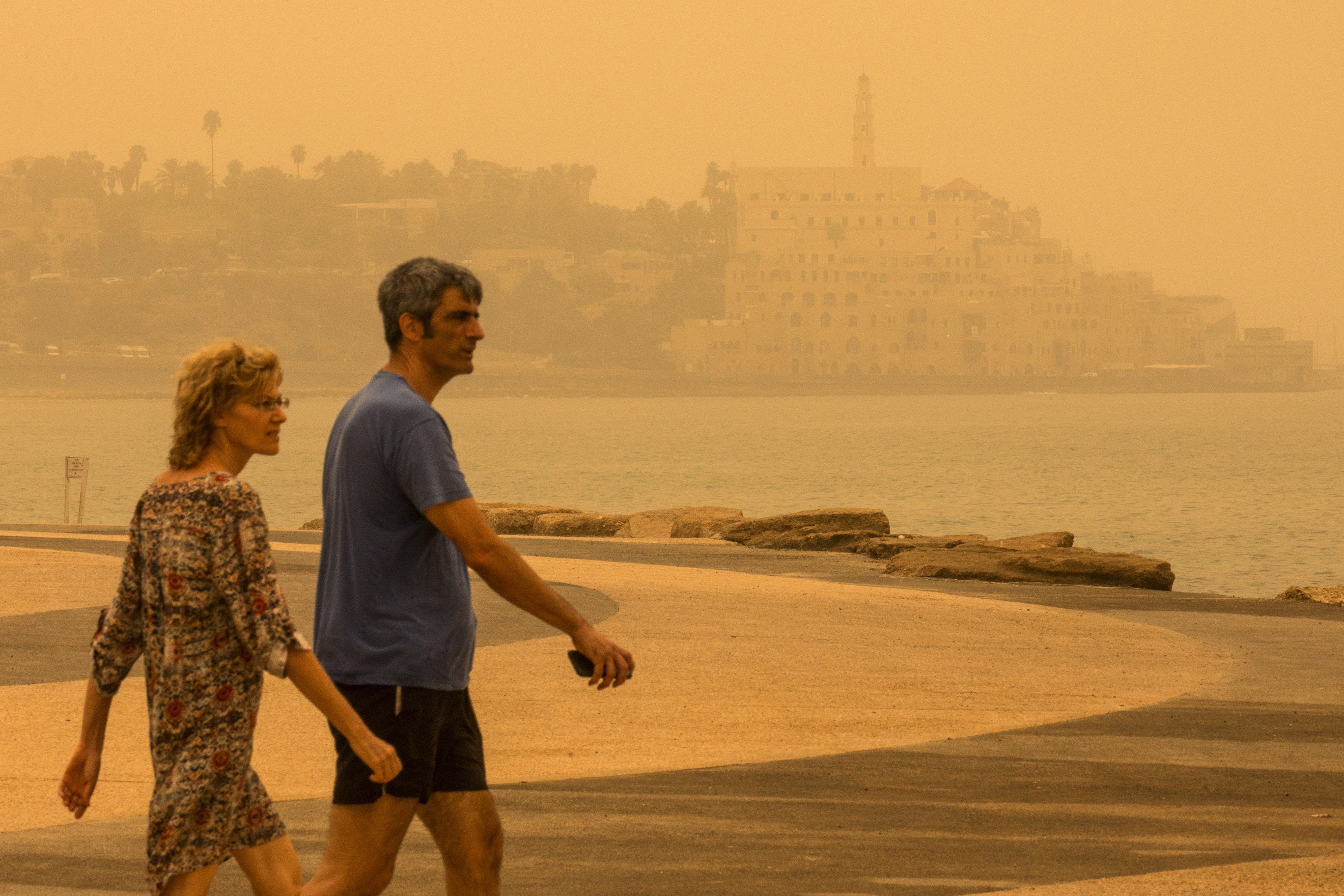 El aire no ventea, todo el país de Israel amaneció cubierto por un ambiente naranja que lo cubría absolutamente todo. La mayoría de la gente esperaba que no durara más de 24 horas. Todos los bancos de autobús y tren, cada superficie expuesta de hecho, se revistió con la suciedad y los niños habían dibujado en la suciedad en las ventanas del autobús.