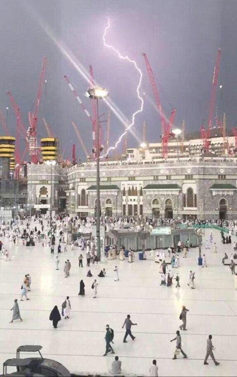 El lamentable accidente ocurrió a las 5:30 de la tarde del viernes pasado, las fotografías muestran que un rayo cayó sobre una de las decenas de grúas que se encargan de la ampiación del área de la mezquita a 400,000 metros cuadrados, que le permitirá acoger hasta 2.2 millones de personas.