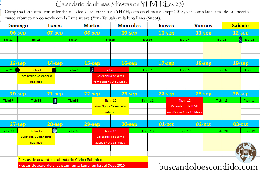 Los cuadros en ROJO, marcan la fiesta contra el calendario Bíblico de YHVH, basado en el avista-miento de la Luna en Israel el día 15 de Septiembre, con eso en mente comenzamos a contar para las fiestas del 7mo mes.