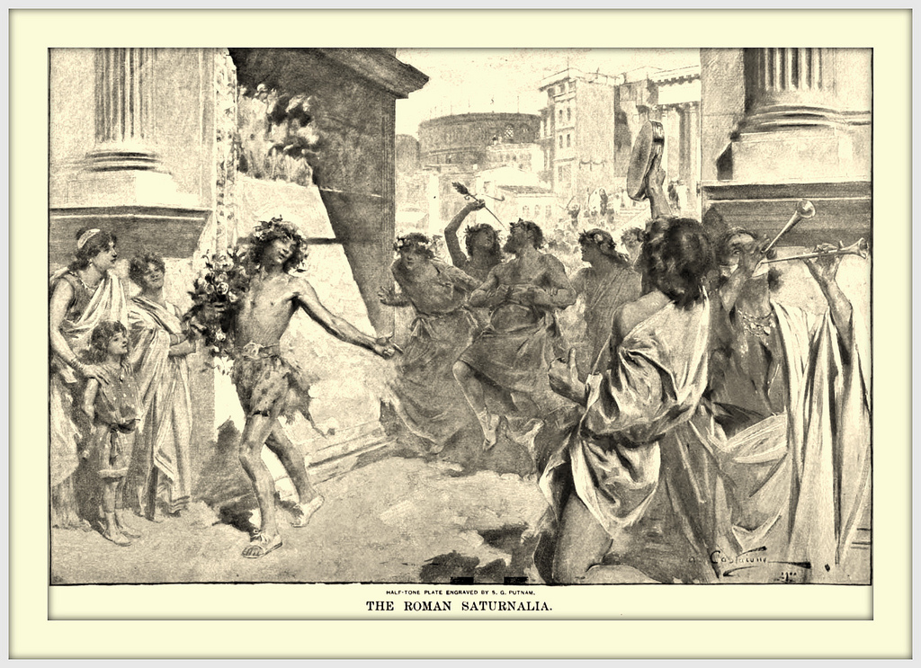 Según la mitología romana, Saturno, el clon del dios griego Cronos, llegó al imperio tras haber sido expulsado del cielo por Jupiter, durante su época de regencia sobre el tiempo y la agricultura, los romanos vivieron una edad dorada, sin guerras, sin malas cosechas, y donde todos los hombres eran libres. En honor a estos tiempos felices, anualmente entre los días, que convirtiéndolos a nuestro calendario, vendría a ser entre el 17 y el 23 de diciembre, a lo largo y ancho del imperio romano se celebraban las fiestas más importantes de su calendario, Las Saturnales.
