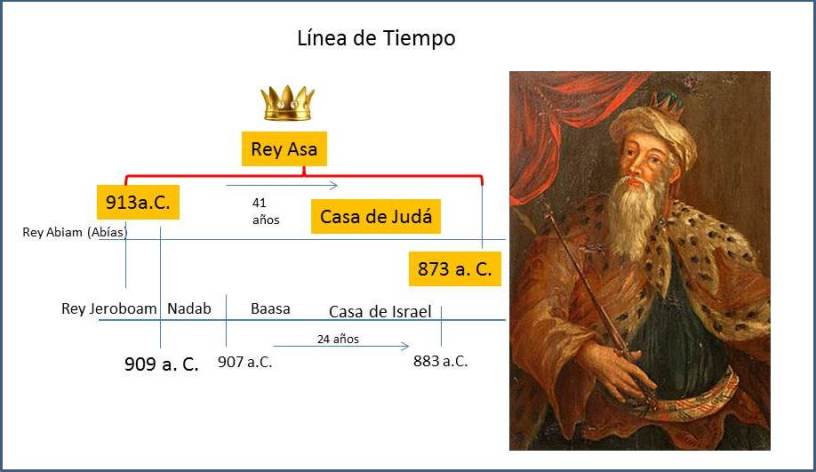 Estando reinando en el reino del Norte (Casa de Israel) aún Jeroboam I, comenzó a reinar Asa hijo de Abiam (Abías) en el reino del Sur (Casa de Judá) y reinó 41 años. Asa fue el tercer rey de la Casa de Judá. Durante su reinado fue visitado por dos profetas.