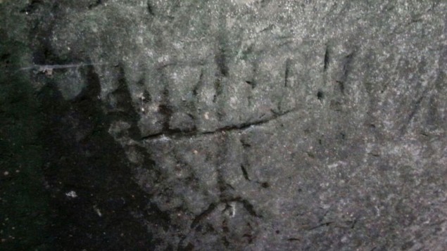 Spelunker Ido Meroz cerca de los grabados que él y sus colegas encontraron en una cisterna en las tierras bajas de Judea en diciembre de 2016. (Mickey Barkal a través de la Autoridad de Antigüedades de Israel)