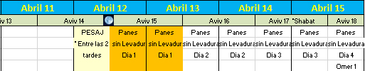 Les comparto un print screen de un calendario que hice para entender como se cuentan los días en Aviv (desde que se vio la Luna nueva en Israel y previamente la cebada madura) para llegar a Pesaj y Panes sin Levadura (Jag HaMatzot).