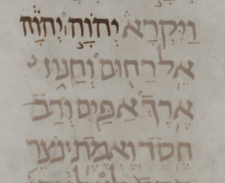 El nombre Yehovah con vocales completas en el texto Damascus Crown, un manuscrito masoreta del siglo 1 en Israel. El pasaje es Exodo 34:6 en donde Dios revela su naturaleza a Moisés: